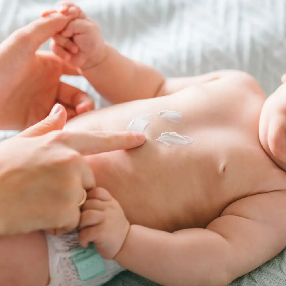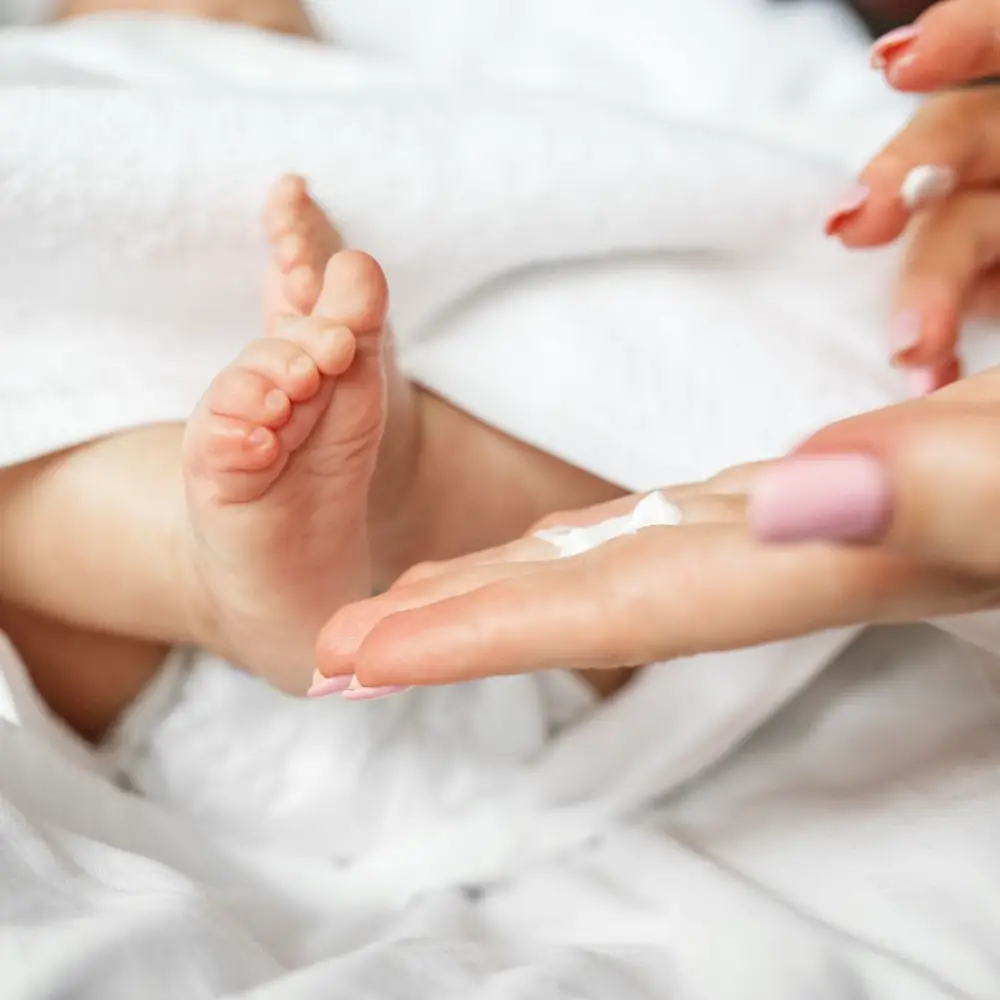 赤ちゃんのお肌には、ボディクリームやボディローションをたっぷりとつかい、十分に保湿してあげるのがポイントです。