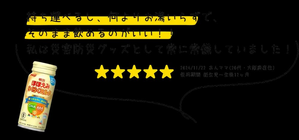 中には防災の備蓄としてだけでなく、日常から「明治ほほえみ らくらくミルク」に助けられているママ・パパもたくさん。