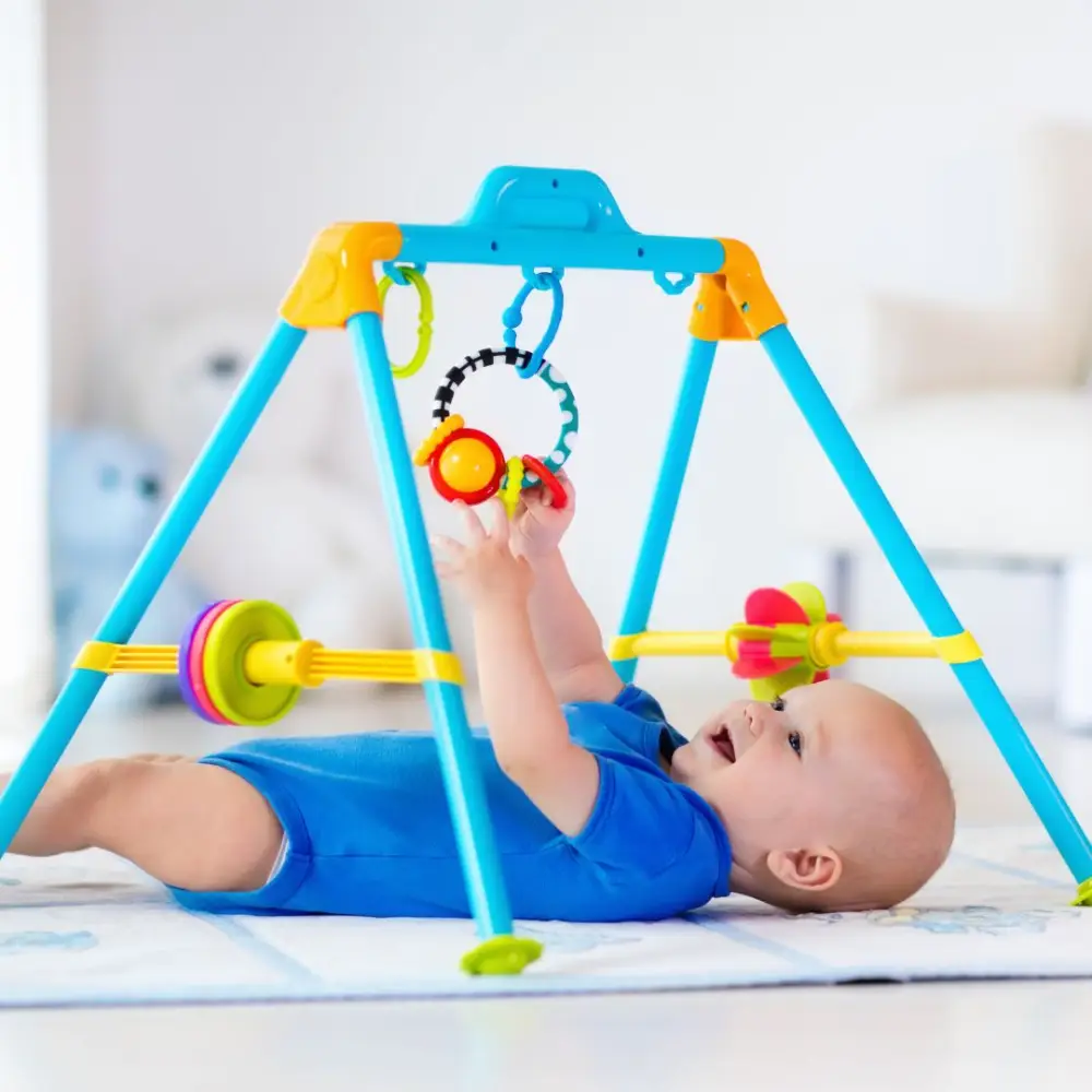 カラフルなおもちゃがついたジムは、赤ちゃんの視覚・聴覚・触覚をやさしく刺激してくれます。