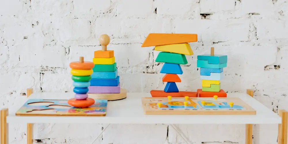 簡単な形合わせや、積み木を重ねる遊びを通して、指先の発達や思考力の基礎を育めます。素材は口に入れても安心な木製やシリコン製が◎。