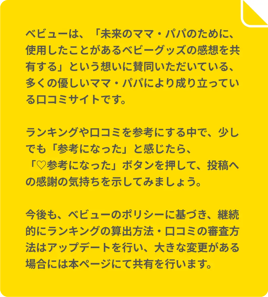 べビューは、日々忙しい妊娠期~育児期のママ・パパの「ベビーグッズ選び」を効率的に行う手助けをしたい、という想いで始まりました。そのため、べビューに承認・掲載されている口コミは全て、実際に使用した経験に基づいています。実際に使用した結果の口コミと判断された場合、星評価の高低にかかわらず、公正に承認・公開をしています。