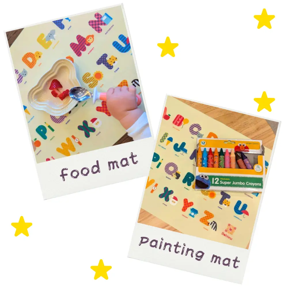 お食事用マットにも、お絵描き用マットにも使うことができ、オリジナルのアルファベット柄がかわいらしいシリコンマット。折りたためるので、持ち運びにもぴったり♪